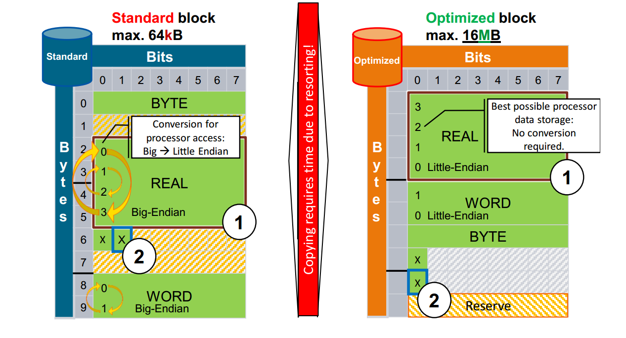 - ==因为处理器架构的改变,新的S7-1500控制器是以"小端"顺序读取的,而非优化的块是以"大端"存储的,因此S7-1500需要额外的处理==